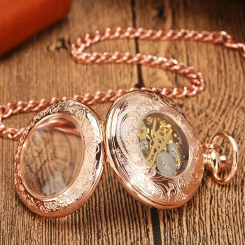 Rose Gold Mechanical Pocket Watch with Roman Numerals and Chain